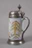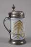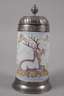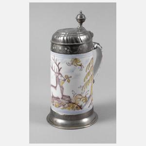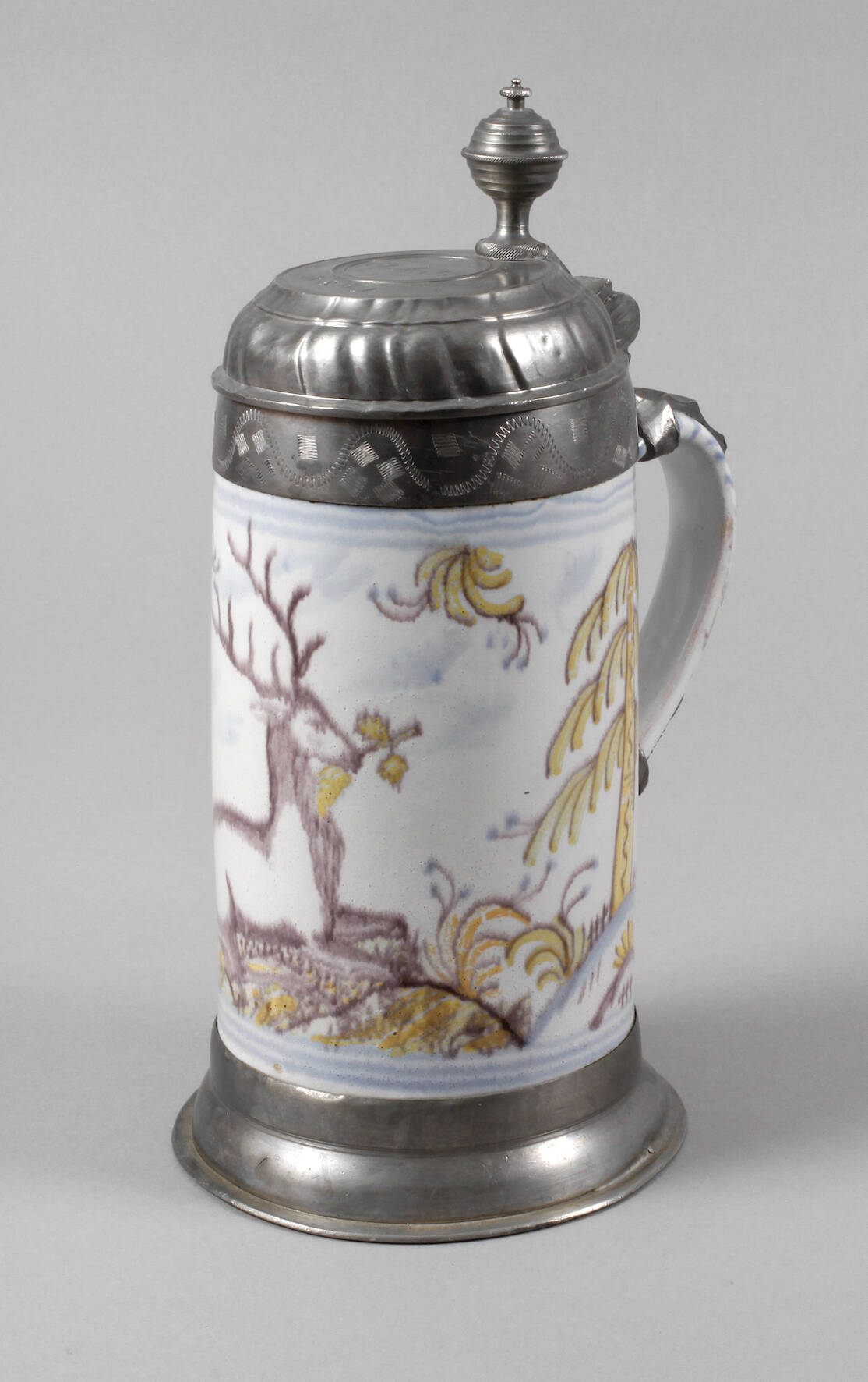 wohl Erfurt, datiert 1821, ungepunzt, Deckelgravur "J.A.K. 1821", auf weißer Glasur in Scharffeuerfarben gebrannt, manganfarben, ein liegender Hirsch, beidseitig Bäume auf Hügeln in Gelb zwischen Zäunen, hellblau gebändert, durchgebödeter Zinnstand, gravierter Lippenrand und godronierter Zinndeckel, Kugelrast sowie ergänztes Zinnband vom Gelenk über den Griff zur Standoberkante, Deckel am Gelenk mit kleinem Riss, sonst sehr gute Erhaltung, etwas schräg im Fuß eingesetzt, H ca. 26 cm.
