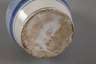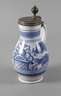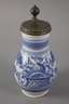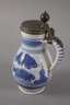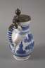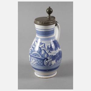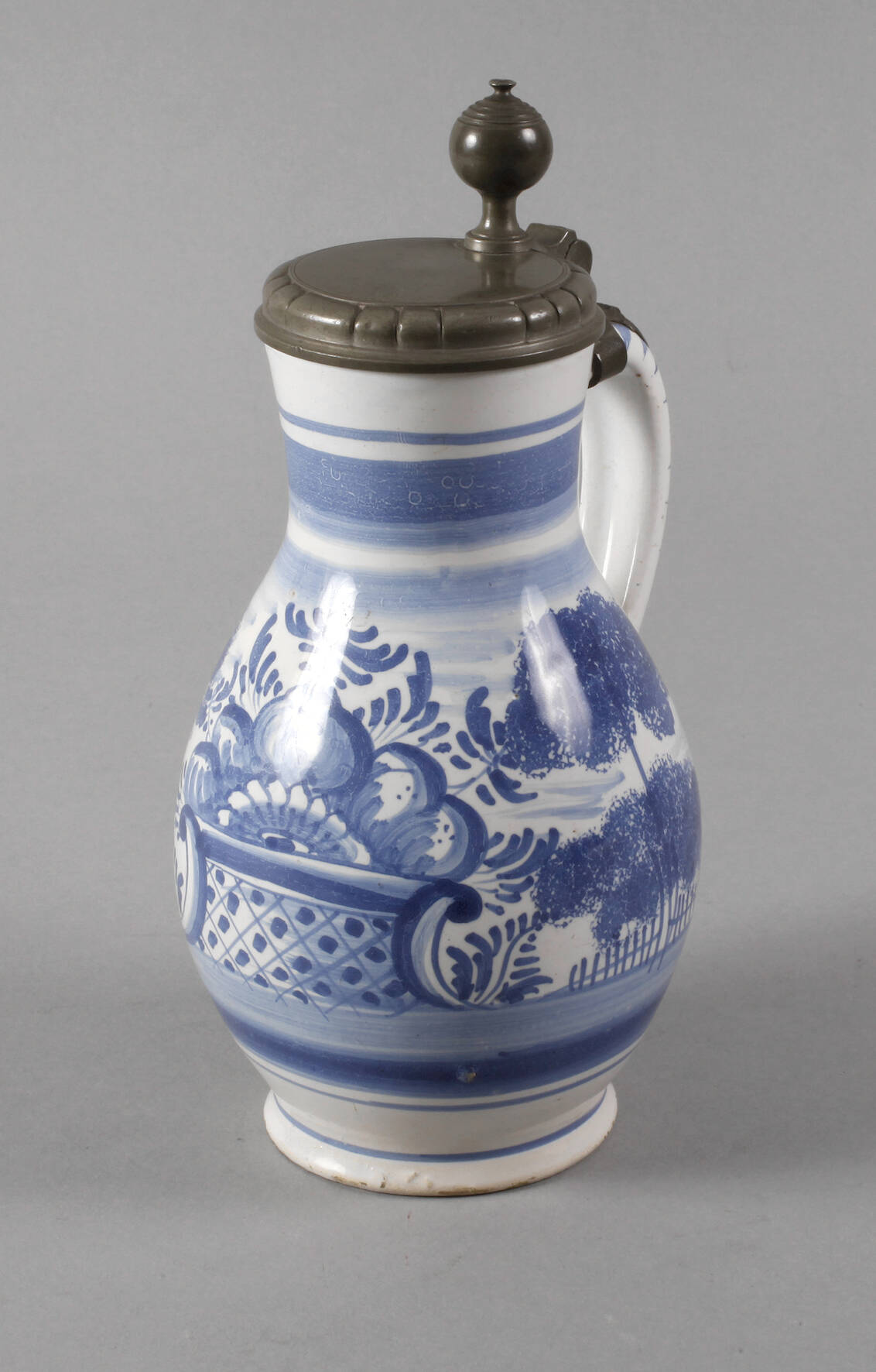 innen unbestimmte Punzen, Besitzermonogramm H.C.F. 1733, auf weißer Glasur mit blauer Scharffeuerfarbe bemalt beziehungsweise geschwämmelt, vorderseitig Früchte und Gitterdekor, seitlich Bäume am Gartenzaun, winzigste Glasurfehlstellen, insgesamt sehr gute Erhaltung, H 25 cm.