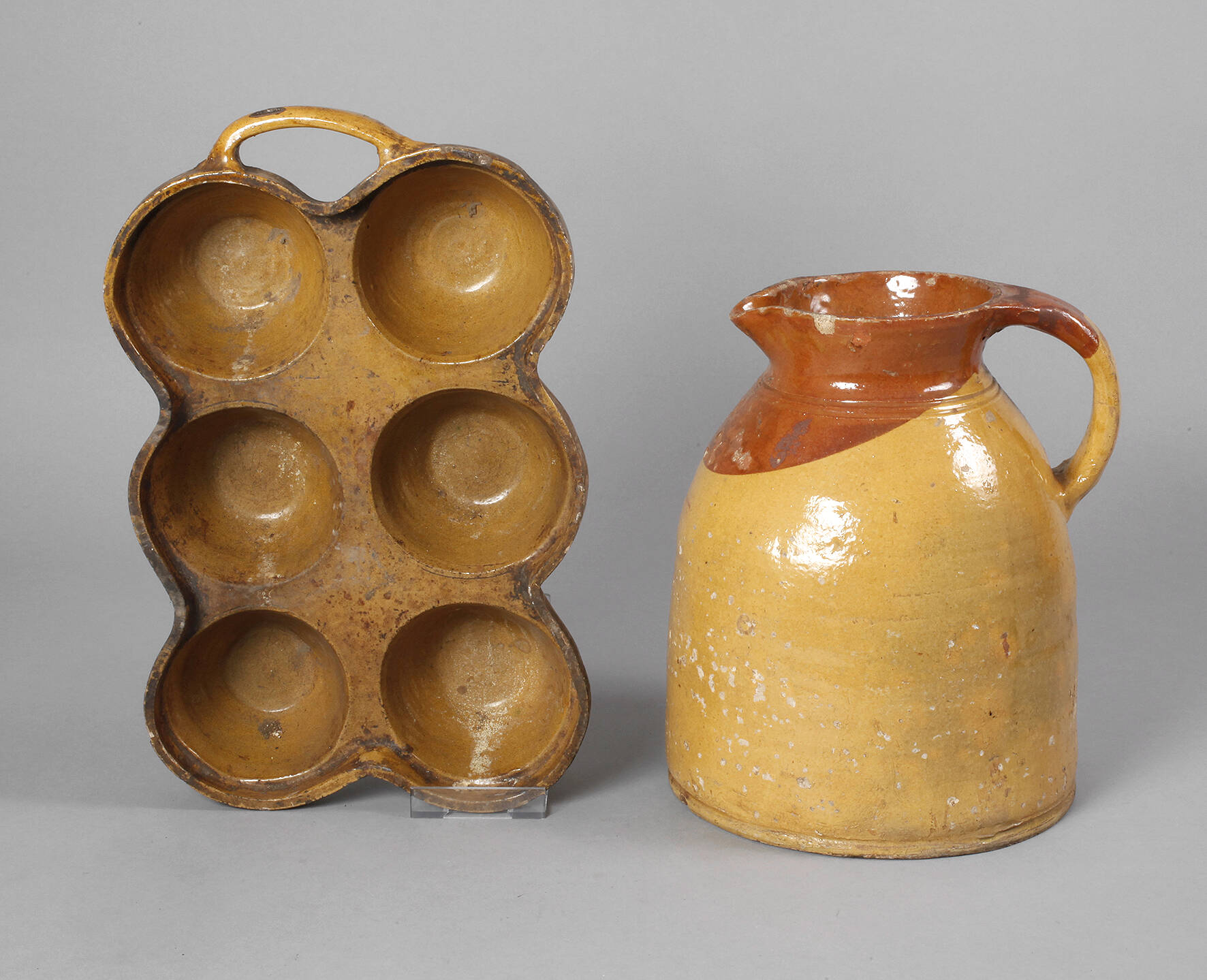 19. Jh., hellbrauner Scherben braun- und salzglasiert, Buchtelform und große Schenkkanne, Glasurfehlstellen und ein kleiner Chip am Kannenrand, L 38 cm, H 30 cm.