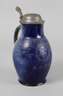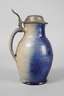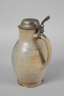 auf der Wandung datiert, graues Steinzeug handabgedreht, am Bauch Kartusche, mit seitlichen Voluten, darüber und darunter Dreiecksmotive, gewölbter Zinndeckel, an Stand und Mündung kleine Chips, H 28 cm.