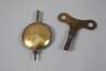 um 1910, ungemarkt, Werk mit Reliefmarke Gustav Bössenroth Berlin, Steingut mit schabloniertem Quadratendekor in Kobaltblau, schwarze arabische Zahlen, geschwärzte Messingzeiger, mit Schlüssel und Pendel, Werk funktionstüchtig, D 30 cm.
