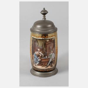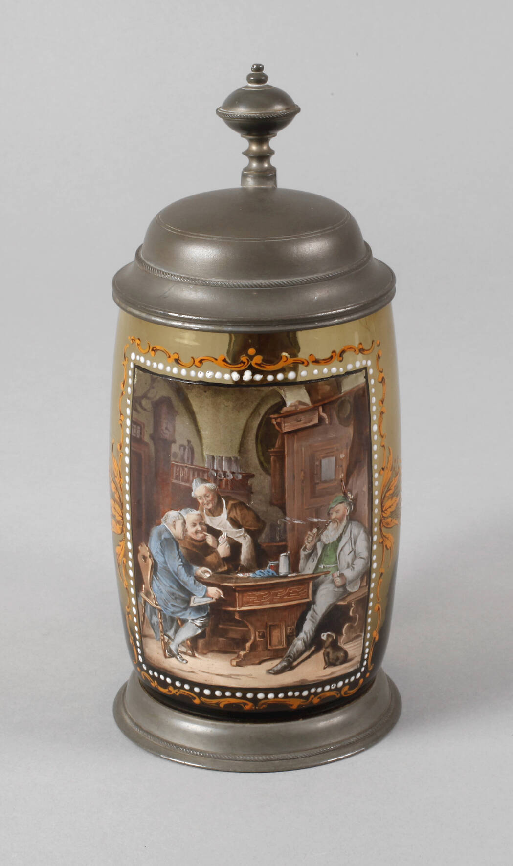 in der Art von Franz Defregger, 2. Hälfte 19. Jh., grünbraunes Glas, ausgekugelter Abriss, farbig bedruckt, bemalt und emailliert, Zinnmontierung, guter altersgemäßer Zustand, H 20 cm.