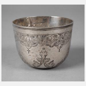 18. Jh., unleserlich gepunzt "CB"?, fein getrieben und graviert mit Blattranken und Ornamentbändern, nach innen gewölbter Boden, verstärkter Lippenrand, innen Vergoldung verputzt, eine kleine alte Reparaturstelle am Rand, sonst guter altersgemäßer Zustand, H 5,5 cm, G ca. 63 g.