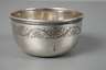 Kopenhagener Stadtmarke mit Datum (19)51, drei weitere Punzen, eine als Waage, nach innen gewölbter Boden, doppelt verstärkter Rand, umlaufend ein graviertes Band aus Weinlaub, guter Zustand, D 6,5 cm, G ca. 38,2 g.