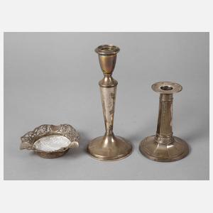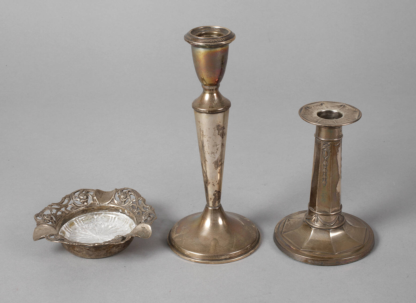 1. Hälfte 20. Jh., ein Kerzenleuchter England, gestempelt "J.D. & S" mit Lion Passant und Kronenmarke für London, der andere gestempelt "Sterling weighted 925", dazu ein Aschenbecher Hildesheimer Rose mit Glaseinsatz, Füße der Leuchter beschwert, alles unbeschädigt, H max. 19,5 cm.
