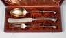 Ende 19. Jh., gestempelt Halbmond, Krone, 800, Herstellerpunze Wilhelm Binder Schwäbisch-Gmünd, Gabel und Löffel mit gedreht gerippten schlanken Griffen und silbernem Hornabschluss, Messer mit Stahlklinge ebenfalls als silberner Horngriff, Laffe, Klinge und Zinke vergoldet, Vergoldung etwas berieben, sonst guter Zustand, im Etui, G total ca. 150 g.