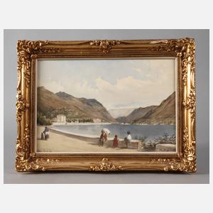 Blick von der Promenade in Blevio über den Comer See auf die umliegenden Berge, Aquarell, Ende 19. Jh., rechts unten signiert „A Brandeis“ links unten betitelt „Blevio Comer See“, Aquarell und Deckweiß, hinter Glas gerahmt, Falzmaß ca. 22 x 32 cm. Künstlerinfo: österreichische Malerein (1848 Miskowitz/Böhmen bis 1926 Florenz), Studium in Prag unter Karel Javurek sowie als erste Frau ab 1867 an der Akademie in Rom bei Michelangelo Grigoletti, ließ sich in Venedig nieder und machte sich als Vedutenmalerin einen Namen. Quelle: Thieme-Becker, AKL und Wikipedia.
