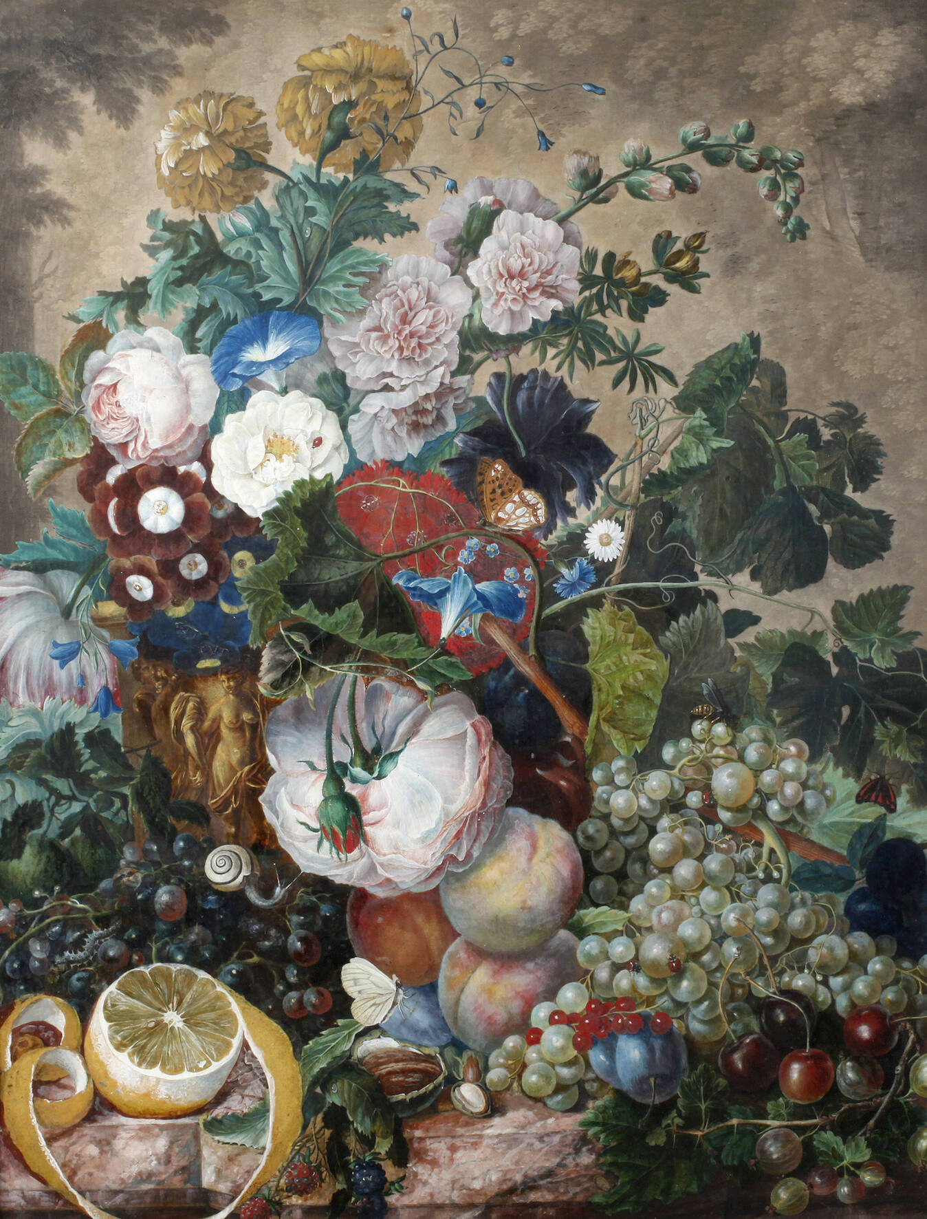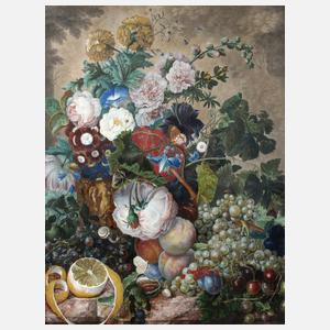 opulentes Stillleben mit verschiedenen Blumen, Früchten und Getier, qualitätvoll übermalte Mezzotintoradierung, um 1780, auf Rahmenrückseite Zettel und hierauf bezeichnet „A Flower Piece von Huysum Pincit/Rich. Earlom Sculpsit In the Cabinet at Houghton John Boydell 1781“, hinter Glas gerahmt, Falzmaße ca. 51,5 x 40 cm. Künstlerinfo: verwendete auch das Pseudonym „Birch“, bedeutender engl. Kupferstecher, Zeichner, Illustrator, Maler und Radierer (1743 London bis 1822 London), Schüler der Malerei von Giovanni Battista Cipriani, 1757 Auszeichnung durch die Londoner Society of Arts, beschickte ab 1762 Ausstellungen in London, um 1765 unter Anleitung von John Boydell Hinwendung zur Ätz-, Schab-, Radier- und Kupferstichkunst, ab 1766 tätig für Boydells Verlag, später auch für die Verlage Evans und R. Sayer, tätig in London, Quelle: Thieme-Becker und Internet.