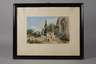 Blick auf eine Klosterpforte in sonnendurchfluteter, mediterraner Landschaft mit einigen Mönchen und Pilgern, Aquarell, Ende 19. Jh., rückseitig auf Zettel alt bezeichnet „Eingang zu einem Kloster in Süd=Italien, Copie nach einem Original- Aquarell von Hildebrandt Berlin. Im Kupferstich-Kabinet der Nationalgallerie zu Berlin copiert von Luisa Pommerening, Kunstmalerin – Berlin“, hinter Glas gerahmt, Blattmaße ca. 25,6 x 40,5 cm. Künstlerinfo: dt. Malerin des 19.–20. Jh., Mitglied im Verband der Bildenden Künstlerinnen, tätig in Berlin, Quelle: Dressler und "Käthe, Paula und der ganze Rest".