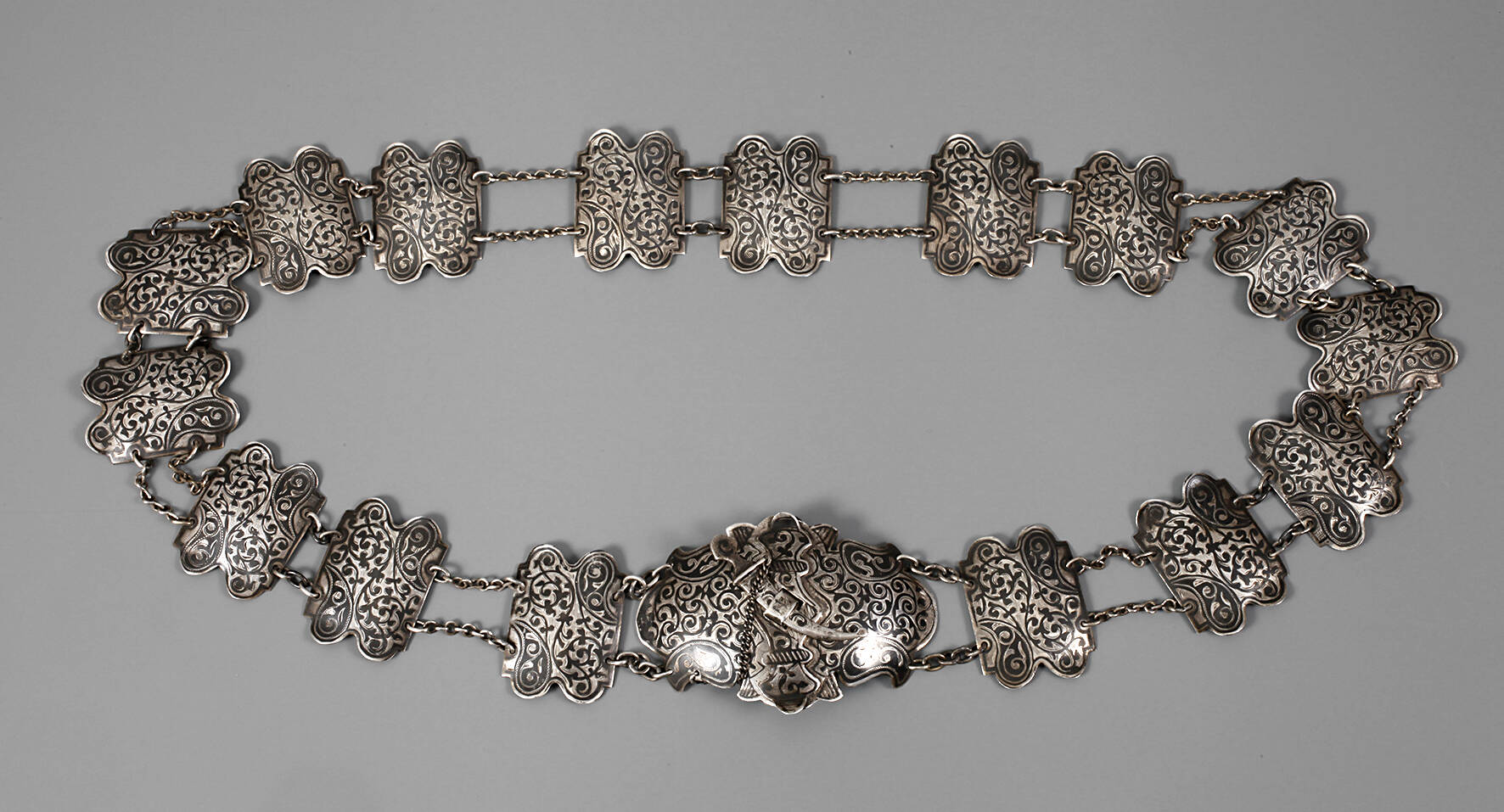 um 1900, Silberstempel 84 Zolotniki, Meisterpunze AK, fein ornamental graviert und geschwärzt, 16 Kettenglieder und die Gürtelschließe mit kaukasischem Dolch, L 106 cm, G ca. 243 g.