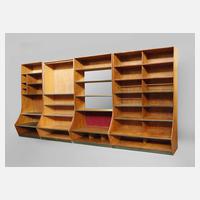 1960er Jahre, bestehend aus vier separat stellbaren Wandregalen, buchefurniert, die Kanten grün gefasst, schlanker, sich nach unten verbreiternder Korpus, ein Teil mit Laufleisten für Glasschiebetür, ein Teil mit verspiegelter Rückwand, dazugegeben kleiner Ladentresen mit neun Schubkästen um 1860, Nadelholz grün gefasst, Alters- und Gebrauchsspuren, rest.bed., Maße 220 x 130 x 47 cm, L gesamt 520 cm.