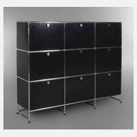 1980er Jahre, Stahlrohr verchromt, Stahlblech schwarz lackiert, modulares Baukastensystem, Schrank mit neun nach vorn klappbaren Türen und Federmechanismus, leichte Gebrauchsspuren, Maße 120 x 150 x 37 cm.