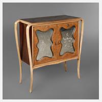 Italien, 1930/40er Jahre, Buche massiv und Nussbaumwurzel furniert, die Türfüllungen aus Spiegelglas mit geätzten Motiven, innen komplett verspiegelt, Oberfläche mit Altersspuren, etwas rest.bed., Maße 100 x 100 x 42 cm.
