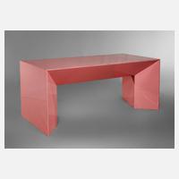 aus der Prisma Serie für Rosenthal 1981, einteiliger Korpus aus gekantetem Stahlblech, dieser pinkfarben lackiert, prismenförmige Beine und Platte, Originallack mit normalen Alters- und Gebrauchsspuren, Maße 76x180x80 cm.