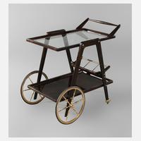 Italien 1970er Jahre, Mahagoni massiv und furniert, Räder aus massivem Messing mit Gummibereifung, eingelassene Glasplatte, im unteren Teil Flaschenhalter, guter Originalzustand, Maße 74 x 76 x 46 cm.