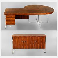 1970er Jahre, ungemarkt, bestehend aus Schreibtisch, Anstelltisch und Aktenschrank, in hellbraunem Zebranoholz furniert, Gestelle aus verchromtem Profilstahl, mit frei in den Raum stellbarem Schreibtisch, optional seitlich mit dreiviertelkreisförmigem großen Tisch, abschließbarer Bücherschrank, innen jeweils mit einem Regalboden versehen, normale Gebrauchsspuren, Maße Schreibtisch 80 x 180 x 80 cm, D Tisch 160 cm, Maße Bücherschrank 82 x 146 x 44 cm.