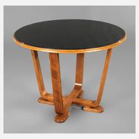 wohl 1950er Jahre, Gestell aus massivem Nussbaum, originale schwarze Glasplatte, normale Altersspuren, H 59 cm, D 80 cm.