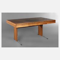 1970er Jahre, Tropenholz auf Eiche furniert, frei im Raum stellbarer Schreibtisch, auf zwei schlanken Kufenfüßen, umlaufend profilierte Platte mit drei Schubkästen und ausziehbarer Ablage auf der Rückseite, normale Alters- und Gebrauchsspuren, Maße 78 x 170 x 85 cm.