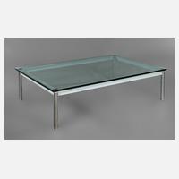 wohl Italien, 1980er Jahre, Gestell aus verchromtem Stahlrohr mit runden Beinen, Zarge aus Flachstahl, schwere 15 mm starke Glasplatte, Maße 33 x 120 x 80 cm.