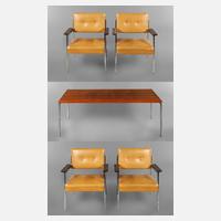 1970er Jahre, bestehend aus flachem Couchtisch mit furnierter Platte auf verchromtem Gestell, dazu vier Armlehnsessel mit beigem Lederbezug und breiten Armauflagen aus Massivholz, normale Altersspuren, Maße Tisch 54 x 150 x 64 cm, Maße Sessel 75 x 65 x 65 cm.