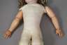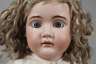 um 1910, gemarkt P sowie Made in Germany, leicht seitlich geneigter Biskuitporzellanbrustblattkopf mit offenem Mund, vier Zähnen oben, Kinngrübchen, gemalten Wimpern unten, modellierten und gefiederten Brauen, feststehenden Glasaugen und blonder lockiger Mohairperücke, an Lederbalgkörper mit Kugelgelenkarmen aus Holz und Masse, alt bekleidet mit Kleid, Unterhose und Schuhen, bespielter Zustand, linker Augenrand und Fußgelenk restauriert, L 75 cm.
