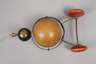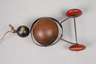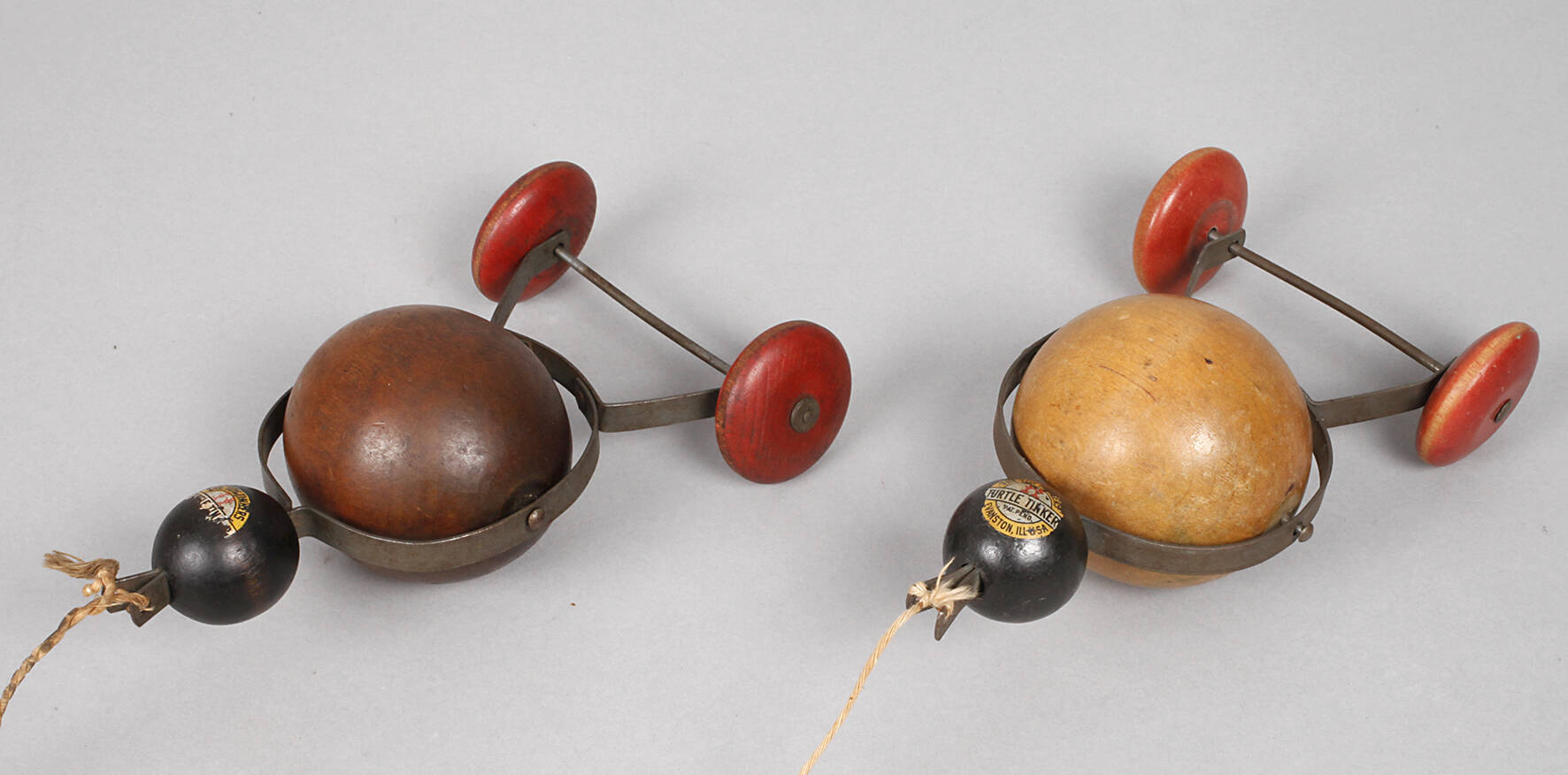1930er bis 1950er Jahre, gemarkt The Turtle Tinkers Pat.Pend. Evanston lll. USA, bandartiger Eisenkorpus in Form einer stilisierten Schildkröte mit vier unterschiedlich farbig gefassten, beweglich gelagerten Holzkugeln und einer Nachziehkordel, als Bewegungsspielzeug zur Förderung der Motorik des Kleinkindes, normale Gebrauchs- und Altersspuren, L je ca. 20 cm.