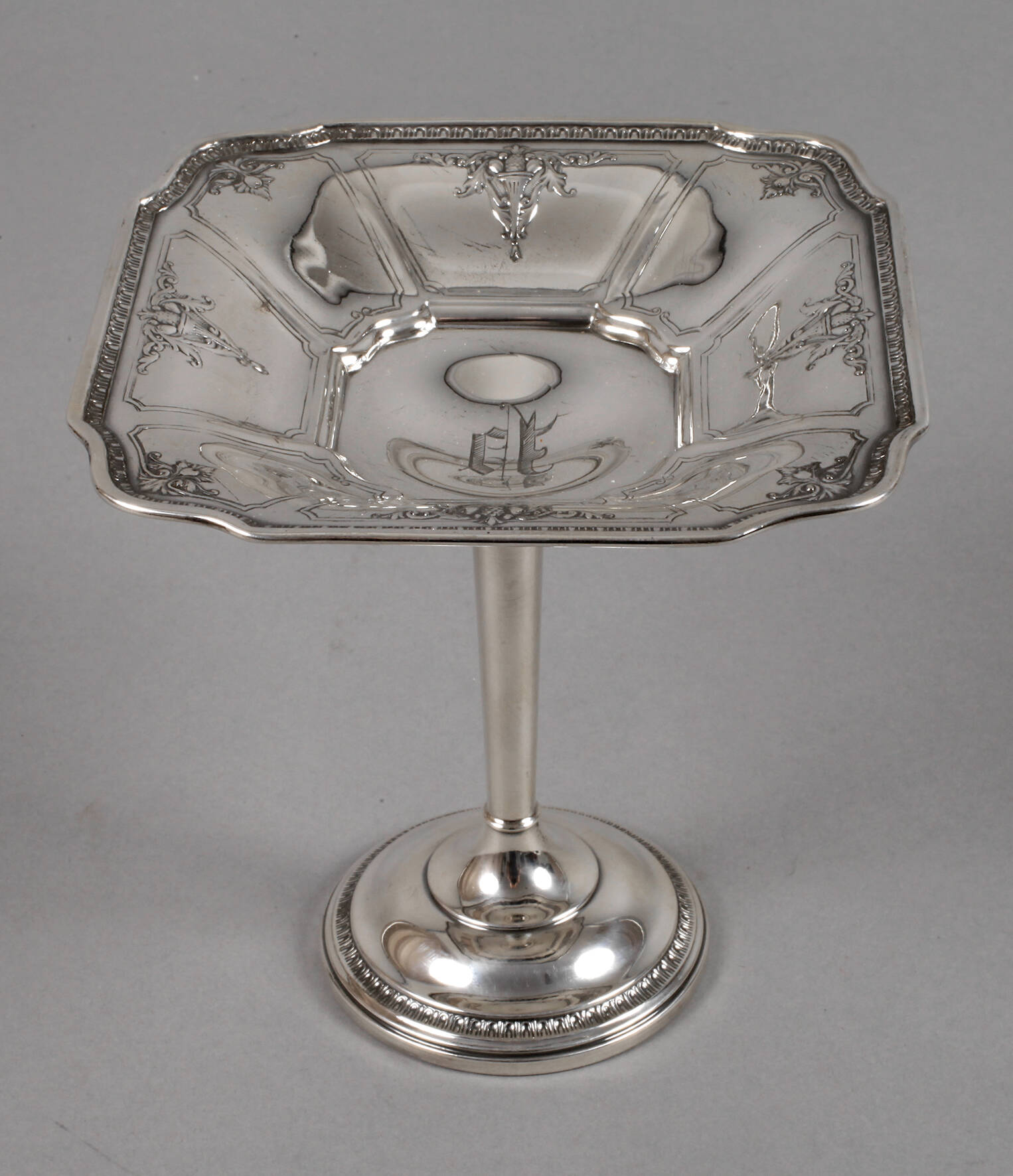 wohl England, Anfang 20. Jh., gestempelt Sterling, Herstellermarke "CW" mit Pfeil, Fußschriftzug "Cement Loaded", verziert mit Füllkörben, Blattranken und Ornamentbändern, graviertes Besitzermonogramm, guter altersgemäßer Zustand, H 14 cm.