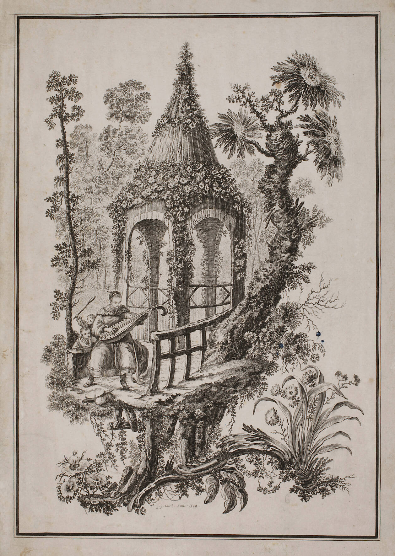 vor einem von Bäumen und Buschwerk umgebenem Tempel musizierender Chinese mit zwei Kindern, Kupferstich, in der Platte bezeichnet und datiert „J. J. avril scul 1774“, einige Farbspritzer, minimale Altersspuren, Darstellungsmaße bis Einfassungslinie ca. 35,7 x 25 cm, Blattmaße ca. 38,7 x 27,1 cm. Künstlerinfo: französischer Graphiker (1744 Paris bis 1831), Schüler von Johann Georg Wille), Quelle: Thieme-Becker und Wikipedia.