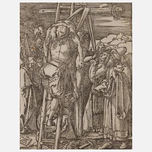 Blatt 26, „Die Kreuzabnahme“, Holzschnitt, geschnitten um 1509-10, wohl späterer Abzug, links unten ligiertes Monogramm „AD“, Bartsch 42, umlaufend Papierrand, kleine Retuschen, auf Unterlagekarton montiert, Darstellungsmaß ca. 12,6 x 9,8, Blattmaße ca. 13,5 x 10,5 cm. Künstlerinfo: bedeutender dt. Maler, Kupferstecher, Holzschnittzeichner und Kunstschriftsteller (1471 Nürnberg bis 1528 Nürnberg), Schüler seines Vaters als Goldschmied, 1486-90 Lehre und Mitarbeiter beim Maler Michael Wohlgemut, 1490-94 Wanderschaft an den Oberrhein, 1494 erste Italienreise, ab 1501 mit Hans Schäuflein, Hans Baldung Grien und Hans von Kulmbach eigene Werkstatt in Nürnberg, 1505 Reise nach Venedig, 1518 Vertreter der Stadt Nürnberg auf dem Reichstag in Augsburg, 1520-21 Reise über Mainz, Frankfurt am Main und Köln nach Antwerpen, leitete anschließend die Ausstattung des Nürnberger Rathauses, Quelle: Thieme-Becker, Wikipedia und Internet.