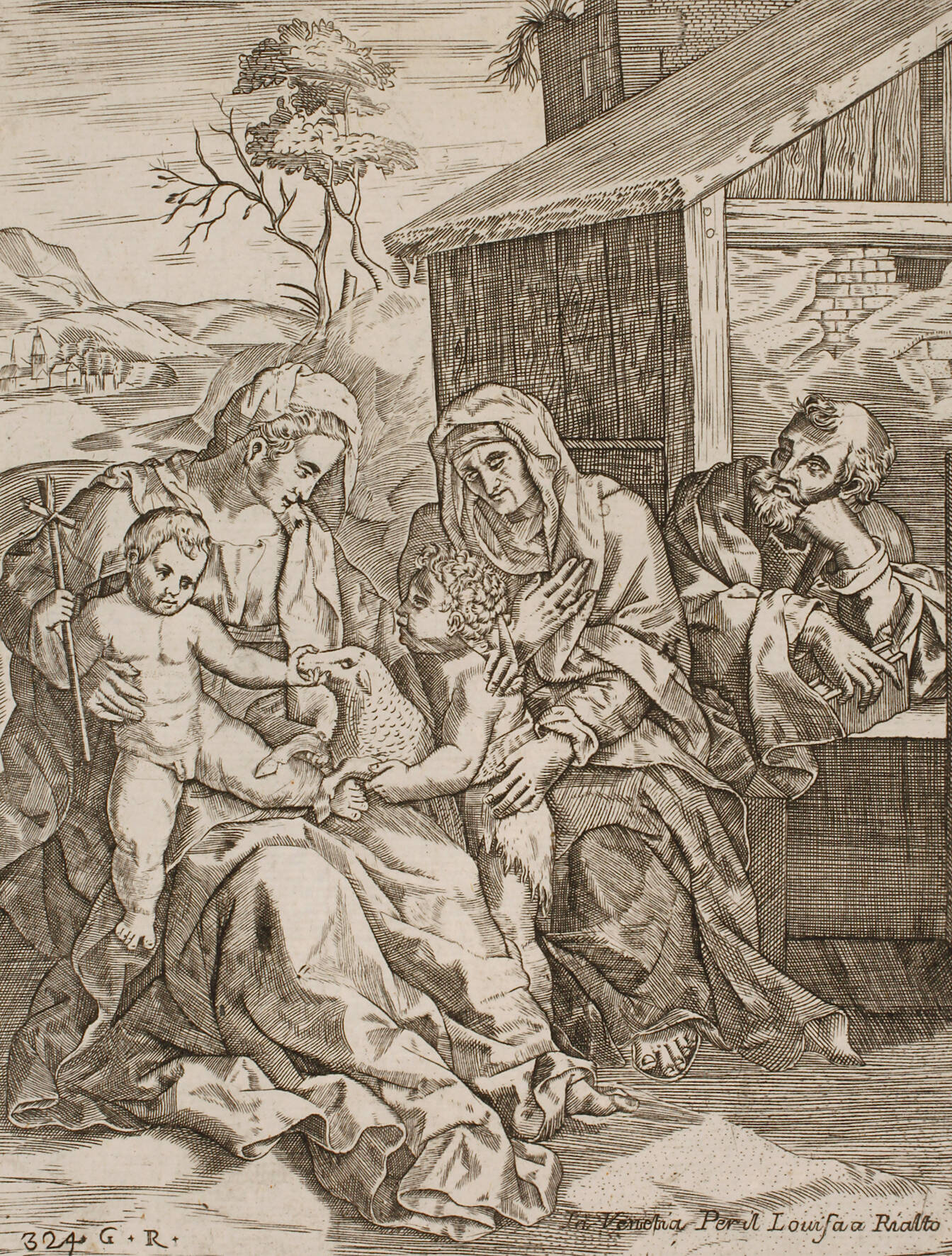 Darstellung der Heiligen Sippe mit dem Jesuskind, Maria, Johannes, Anna und Joachim neben einer Hütte in bergiger Landschaft, Kupferstich, 16. Jh., im unteren Bereich in der Platte rechts bezeichnet „… Venetia Per il Louisa a Rialto“ und links nummeriert und monogrammiert „324 G. R.“, ungewöhnlich breitrandiges Exemplar, etwas fleckig und Altersspuren, Darstellungsmaße ca. 19,7 x 15,5 cm, Blattmaße ca. 39,8 x 27,1 cm.