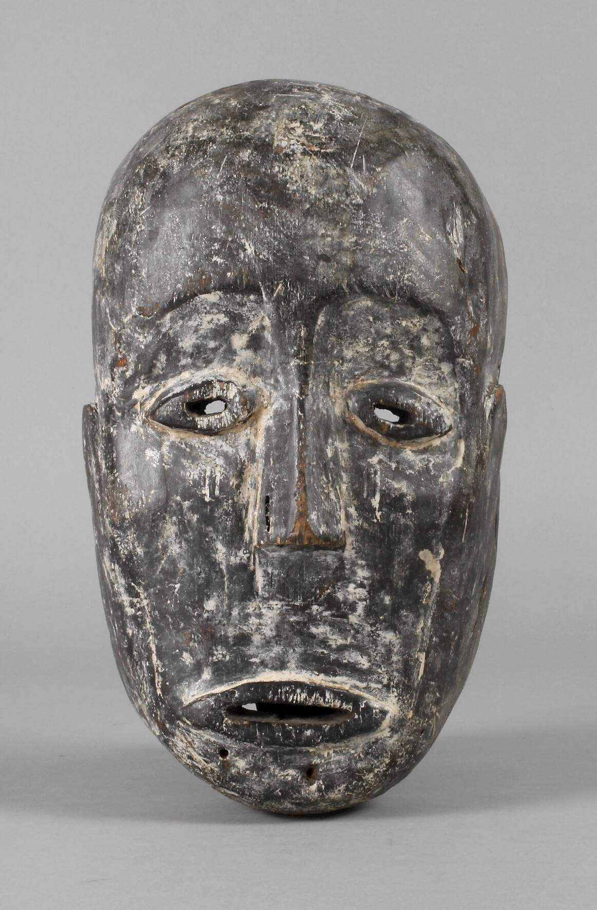 Kongobecken, Ende 19. Jh., dem Stamm der Baka zugeordnet, leichtes Tropenholz, schwarz gefasst und mit Resten alter Kalkfarbe, leicht vorstehende Augen, etwas geöffneter Mund, H 30 cm.