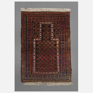 Mitte 20. Jh., kleiner Gebetsteppich von dunklem Kolorit, das Mittelfeld hell abgesetzt, zahlreiche umlaufende Bordüren, kleinere Randbeschädigungen, Maße 124 x 83 cm.
