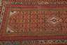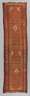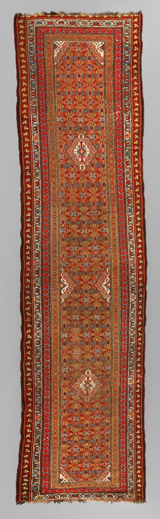 um 1920, Galerie mit kleinteilig durchmustertem Mittelfeld mit wenigen abgesetzten hellen Rautenmotiven und mehrteiligen, umlaufenden Bordüren, Schmalseiten gekürzt, Altersspuren, Maße 334 x 93 cm.