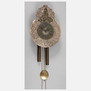 Mitte 20. Jh. im Stil des 18. Jh. gefertigt, auf dem Zifferblatt signiert, Telleruhr, Messingblech partiell versilbert, römische Zahlen, Werk mit Halbstundenschlag auf Tonfeder, funktionstüchtig, H 43 cm.