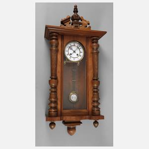 um 1900, Werk mit Flügelradmarke Friedrich Mauthe, Nussbaumgehäuse mit originaler Bekrönung, eine Zierleiste fehlt, Werk reparaturbedürftig, H 85 cm.