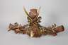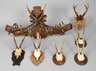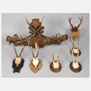 1. Hälfte 20. Jh., jagdliche Garderobe, Eichenlaub beschnitztes Laubholzbrett, farbig gefasst, aufgeschraubte Garderobenhaken aus Geweihstangen und Rehfuß, dazu sechs kleine Jagdtrophäen, mit montierten Rebockgehörnen, auf geschnitzten Holzplatten, unterschiedliche Maße und Erhaltungen, L max. 72 cm.