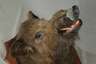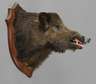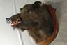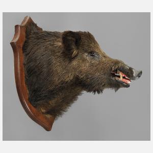 1. Hälfte 20. Jh., auf wappenförmiger Eichenholzplatte montiertes, voll präpariertes Eberhaupt mit eingesetzten Glasaugen und originalem Gewaff, Altersspuren, H 80 cm.