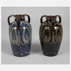 um 1900, ungemarkt, Modellnr. 932 5, Paul & Anna Wranitzky Frainersdorf, dunkelbrauner Scherben mit geometrischer Schlickermalerei und farbloser Glasur, an der Mündung drei gebogte Henkel, stilisierter floraler Dekor, guter Zustand, H 21 cm.