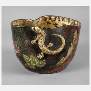 um 1900, vermutlich aus der Familie Massier in Vallauris, Monogramm "JTM.", Majolika verziert mit reliefierten Blüten und plastischen Tiermotiven, handbemalt und farblos glasiert, Gebrauchsspuren und Alterscraquelé sowie minimale Fehlstellen, H 16 cm.