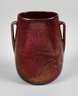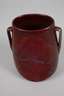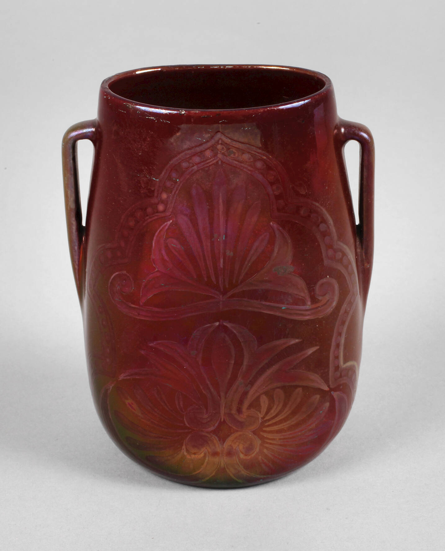 Frankreich, um 1900, ungemarkt, gebauchte Ovalform mit seitlichen Bandhenkeln, geätzter Ornamentdekor, dunkelrote lüstrierende Glasur, normale Gebrauchs- und Altersspuren, H 13,5 cm.