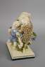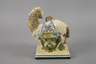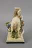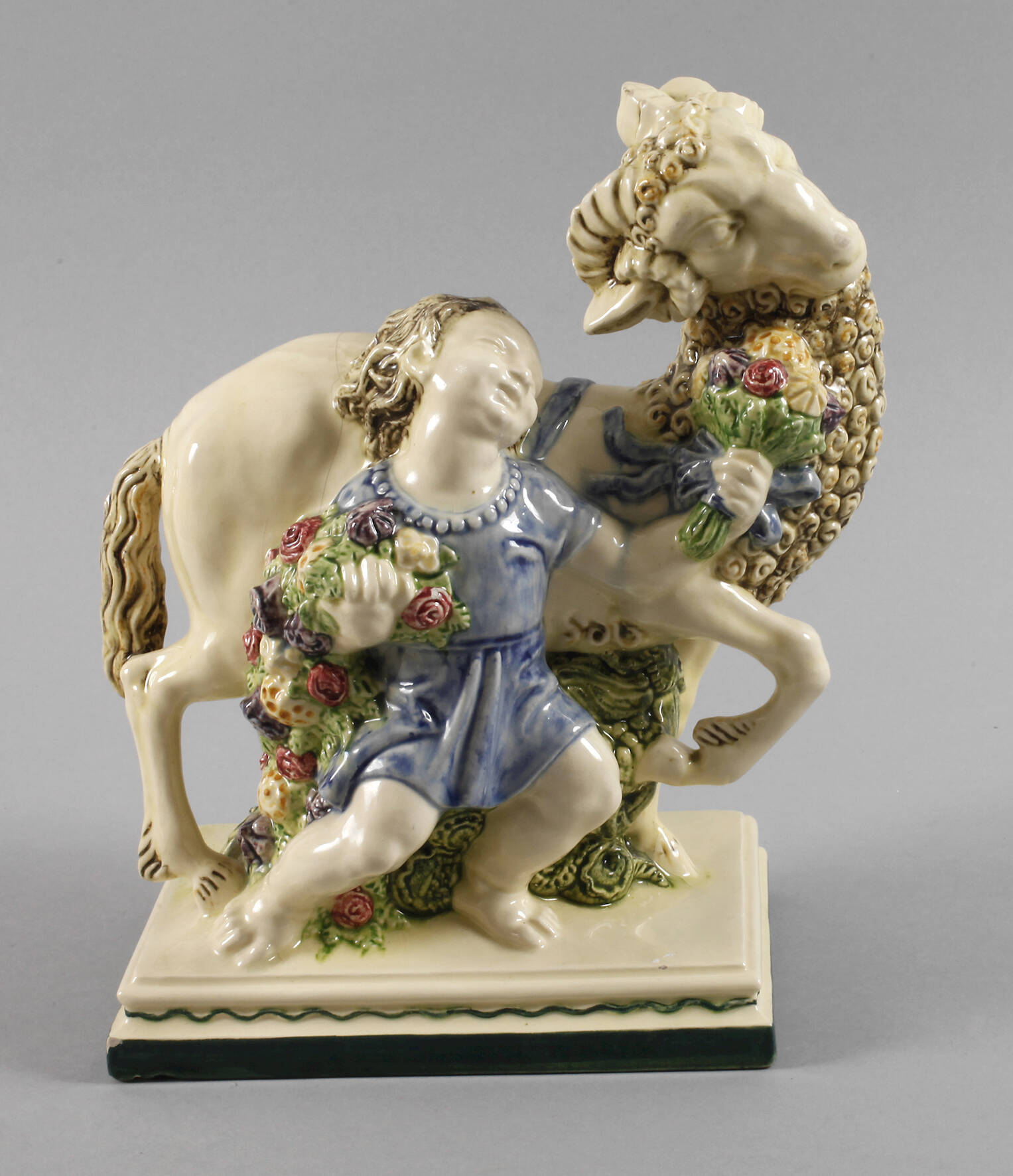 1920er Jahre, Pinselmarke mit Buchstabe P. für Michael Powolny?, Modellnr. 152, Steingut bemalt und farblos glasiert, junges Mädchen mit Blütengirlande und Blumenstrauß, an einem kapitalen Widder stehend, dieser als Vertikonippes mit rückseitiger Schale, Alterscraquelé und ein Haarriss, minimalste Glasurfehlstellen, H 30 cm.