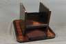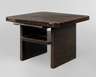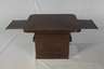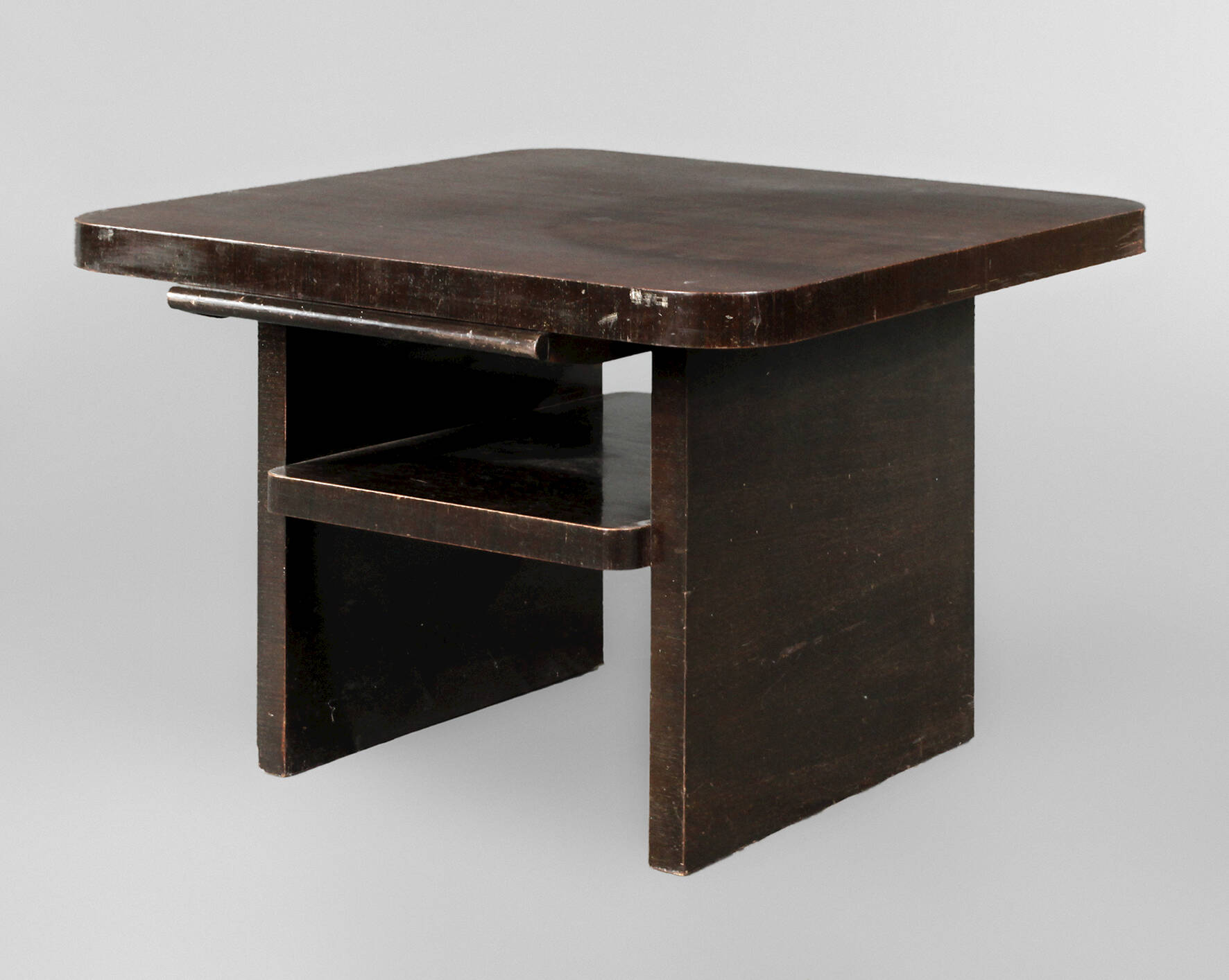 Entwurf um 1930, Ausführung Vereinigte Werkstätten Dresden Hellerau, nussbaumfurniert, dunkelbraun gebeizt, quadratische Platte mit abgerundeten Ecken, darunter zwei kleinere Auszüge und Ablage, Oberfläche rest.bed., Glasscheiben fehlen, Maße 65 x 95 x 95 cm.