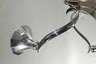 um 1930, verchromtes Metallgestänge mit zentralem trichterförmigen Schirm aus satiniertem Klarglas, daran sechs s-förmig geschwungene kurze Leuchterarme, jeweils eine Lampenfassung in Form einer stilisierten Blüte tragend, ohne Schalen, insgesamt neunflammig, elektrifiziert, Altersspuren, H ca. 95 cm, D ca. 70 cm.