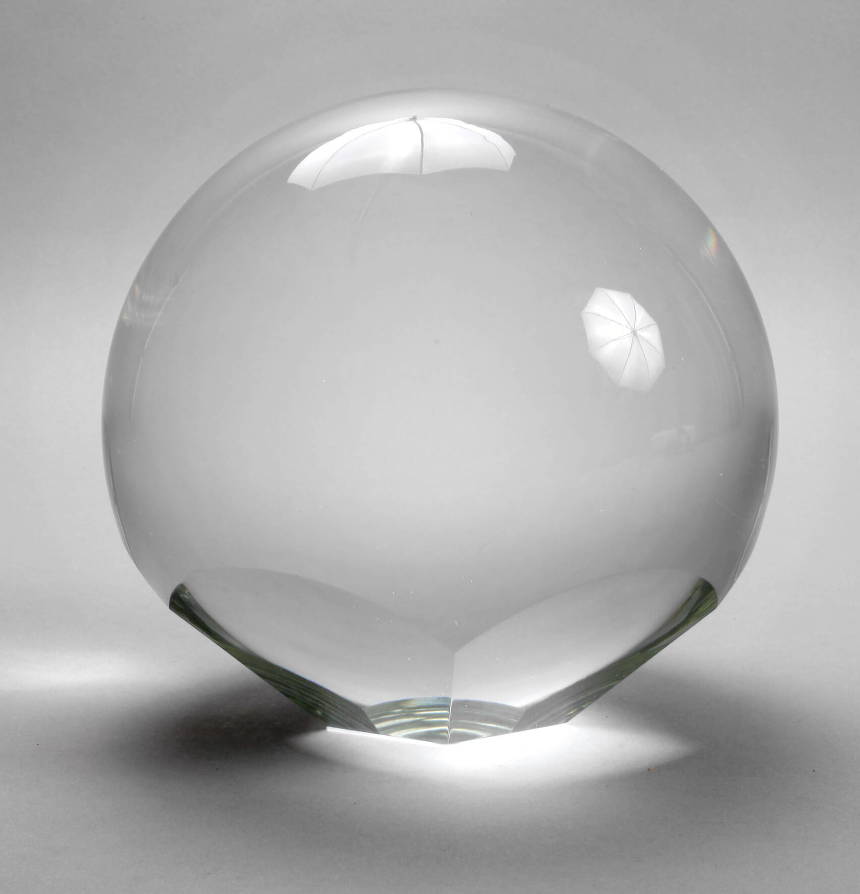 2. Hälfte 20. Jh., signiert, Sammlungsetikett Pauly & C., leicht grünliches massives Glas mit plangeschliffenem Stand, oberhalb des Standes verlaufend hexagonal facettiert, guter Zustand, D 20 cm.