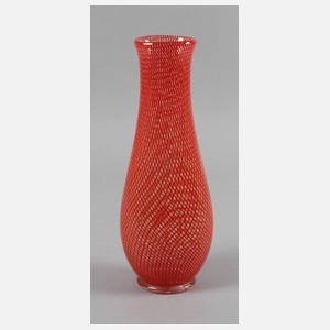 Entwurf Dino Martens für Vetreria Aureliano Toso, 1950er Jahre, farbloses Glas, ausgekugelter Abriss, angesetzter ovaler Standring, eingeschmolzene rote Fäden kleine Rauten ergebend, dazwischen kleine eingeschlossene Luftblasen, sehr schöner Originalzustand ohne Beschädigungen, H 36,5 cm.