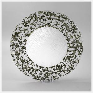 signiert und datiert 1999, farbloses mattiertes Glas, mittig gemuldet mit eingeschmolzener wabenartiger Struktur, die flache Fahne gerippt mit eingeschmolzenen moosfarbenen Plättchen, guter Zustand, D 40 cm.
