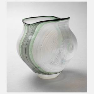datiert (19)84 Lauscha in Thüringen, signiert, dünnwandiges Klarglas mit feinen eingeschmolzenen Spiralfäden in Weiß, Grün und Schwarz, guter unbeschädigter Zustand, H 13 cm.