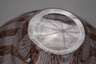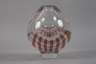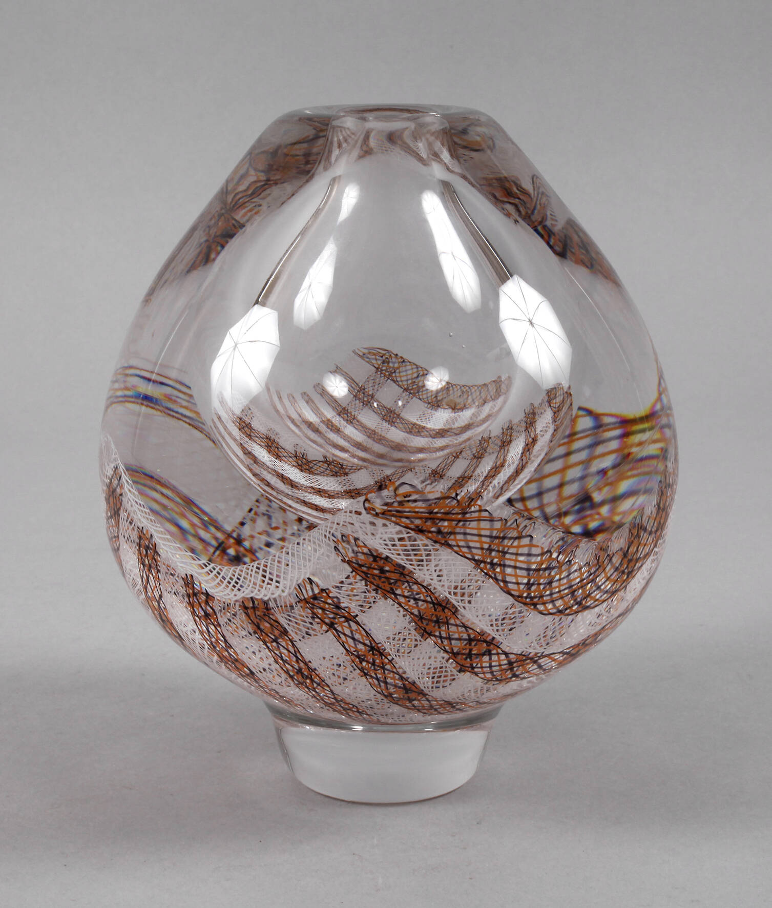 auf der Unterseite signiert und bezeichnet "Gary Beecham 1991 Woven Textile Vessel", massives farbloses Glas mit ausgekugeltem Abriss, eingeschmolzene Zanfiricostäbe in Murano-Art, eine textile Struktur ergebend, sehr guter Zustand, H 20 cm.