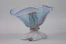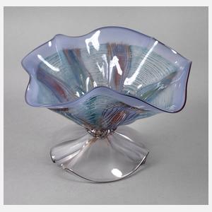 John Littleton und Kate Vogel, signiert und datiert 1981, violettes opalines Glas, der Fuß gefaltet mit blasigem Abriss, darüber ein umlaufendes frei geformtes Band, die Schale gelappt, mit geometrischen Farbeinschmelzungen in Form von gewebten Mustern mit blasigen Einschmelzungen, H 20 cm, D 29 cm.