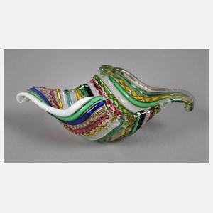 Entwurf Dino Marten 1950er Jahre, farbloses Glas, plangeschliffener Stand, zusammengesetzt aus einzeln geformten Zanfiricostäben, mit Farbeinschmelzungen und Kupferaventurin, unregelmäßig geformt, schöner unbeschädigter Originalzustand, L 20 cm.